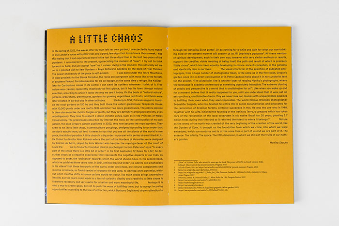 Autorská kniha Kew Gardens je výstupom z fotografického a zároveň aj výstavného projektu a patrí do trojice autorských kníh, z ktorých fotografie Monika Stacho premiérovo vystavila na výstave Záh(r)ady – Garden´s Mysteries v Galérii Profil v Stredoeurópskom dome fotografie na jar 2024.
